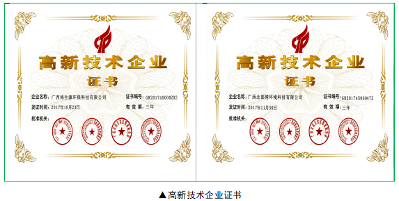 近日,自治區(qū)科技廳、自治區(qū)財政廳、自治區(qū)國稅局、自治區(qū)地稅局聯(lián)合向鴻生源下屬的鴻生源環(huán)保科技有限公司和北部灣環(huán)境科技有限公司頒發(fā)了高新技術企業(yè)證書